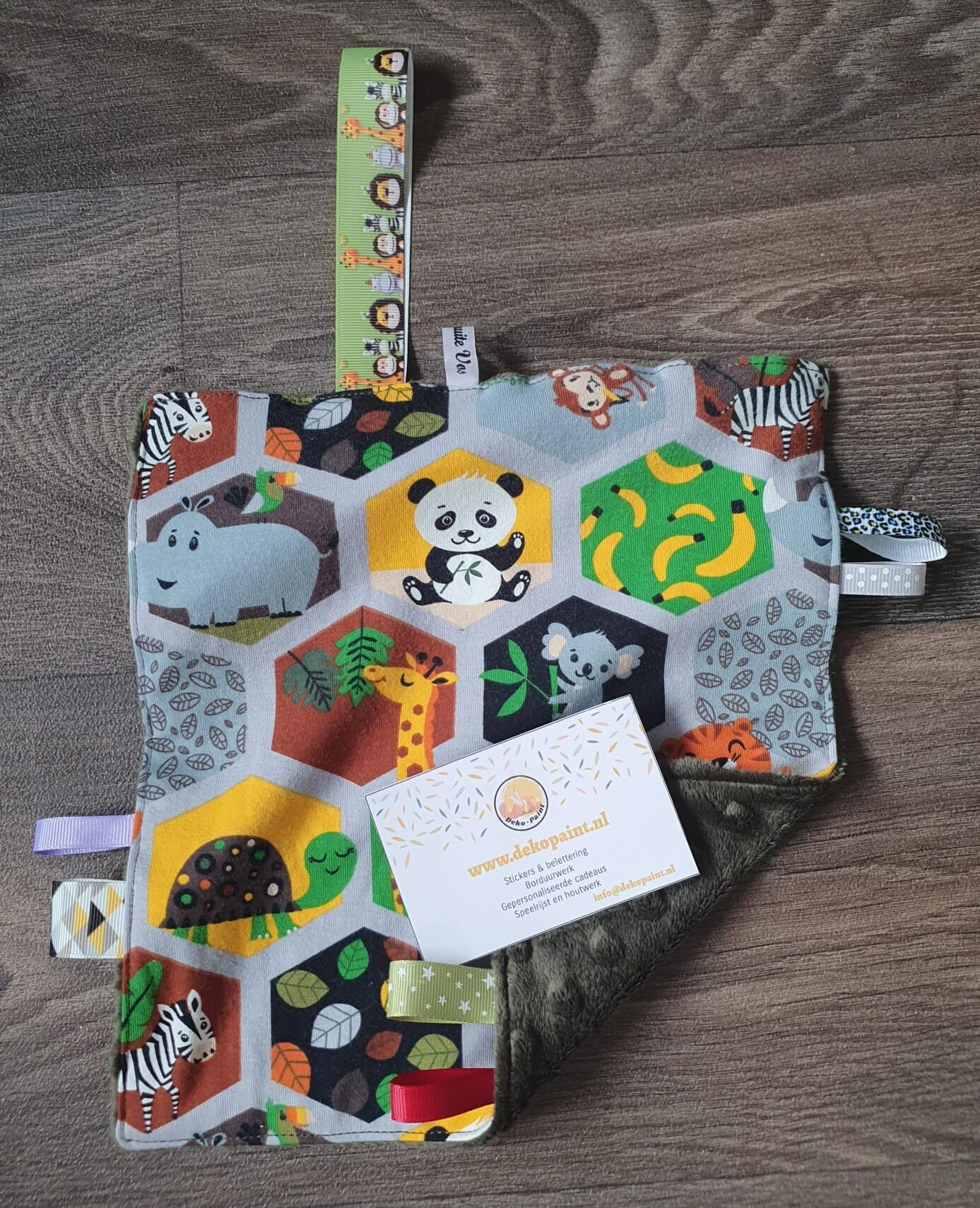 Wij maken de doekjes met veel liefde en zijn erg zorgvuldig. Laat uw kind nooit zonder toezicht met het doekje spelen.